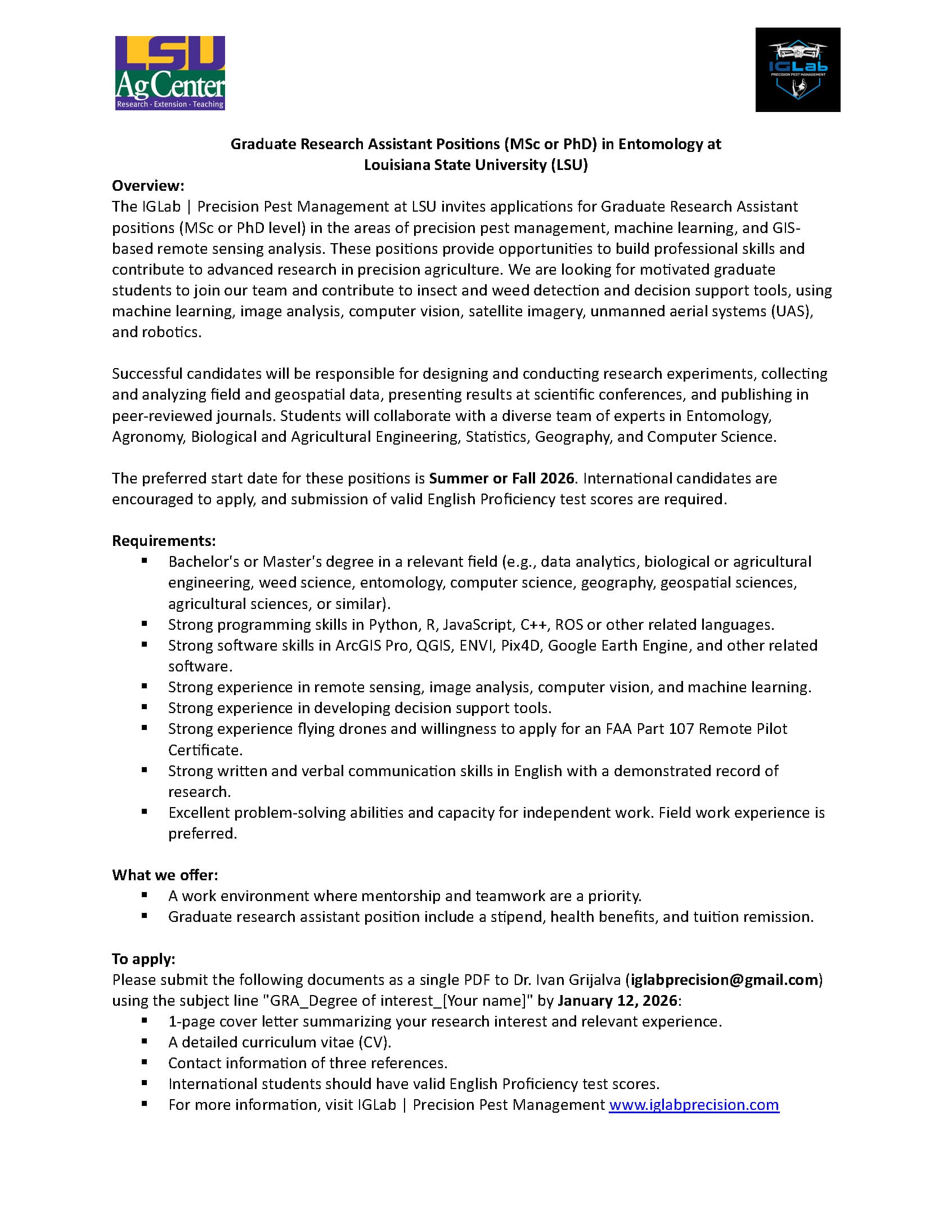 If you are interested in joining the IGLab | Precision Pest Management as a visiting scholar or student intern, please contact Dr. Ivan Grijalva (iglabprecision@gmail.com) for further details.