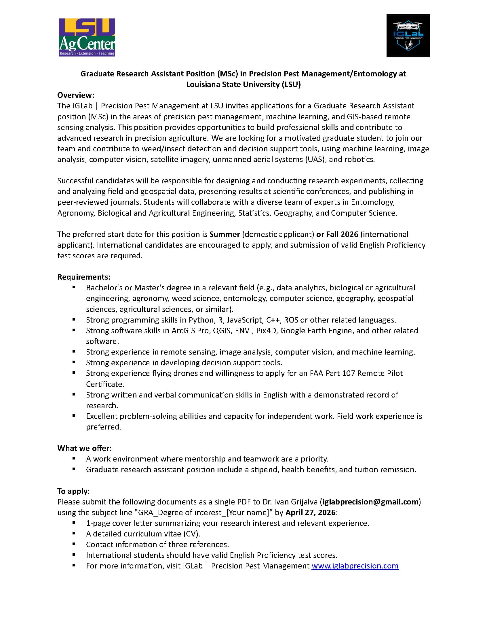 If you are interested in joining the IGLab | Precision Pest Management as a visiting scholar or student intern, please contact Dr. Ivan Grijalva (iglabprecision@gmail.com) for further details.
